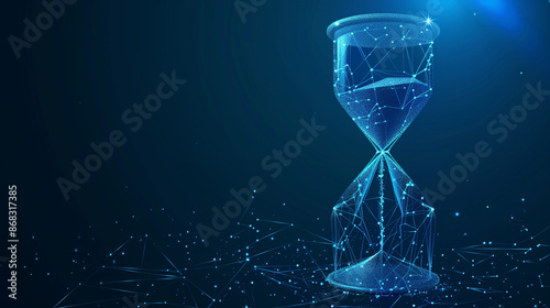 Digital Hourglass, Line and Triangle Icon with a Network of Points, Networked Time, Hourglass Icon in a Web of Lines and Triangles, Geometric Hourglass, Lines, Triangles, and Points on a Blue Backgrou