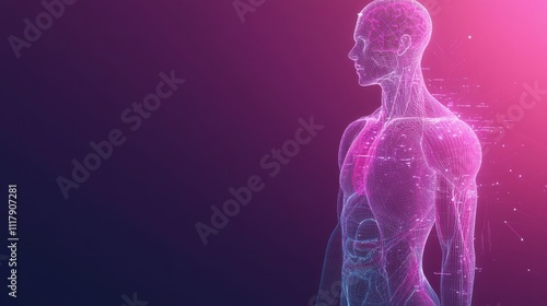Digital Human Anatomy: A 3D Wireframe Model of the Male Torso Illustrating Internal Organs and Musculature with Pink and Purple Gradient Background