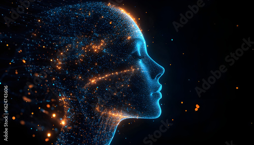 Digital human face composed of glowing blue and orange data points and circuits representing artificial intelligence and futuristic technology visualization in profile view