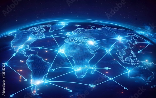 Digital illustration of a connected world map showcasing global networking and communication. Bright lines and nodes visualize data exchange and technological reach.