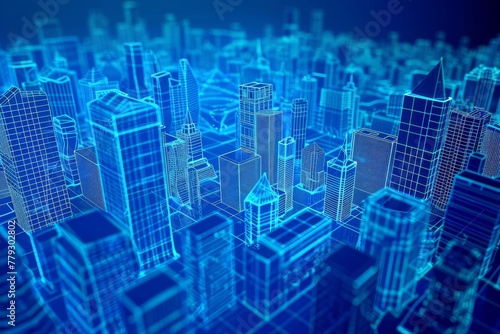 digital illustration of a digital city with glowing neon lines and holographic effects