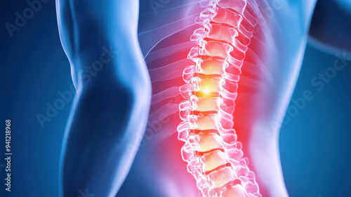 Digital illustration of a human spine showing pain points in the lower back with a blue background highlighting anatomical features