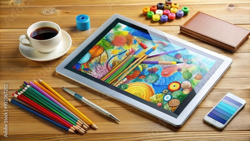 Digital illustration of a modern tablet computer with a stylus on a wooden desk, surrounded by creative scattered sketches and colorful art supplies.
