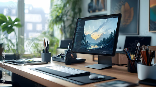 Digital Illustration of a Mountainous Landscape on a Desktop Computer Screen