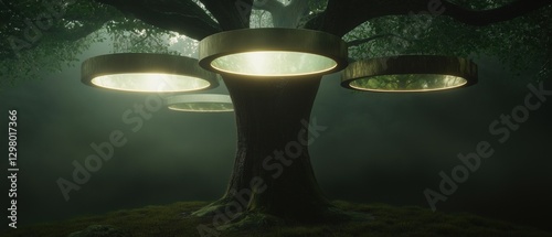 Digital illustration of a tree with three circular lights hanging from its branches. the tree is in the center of the image, with its trunk and branches reaching upwards towards the sky.