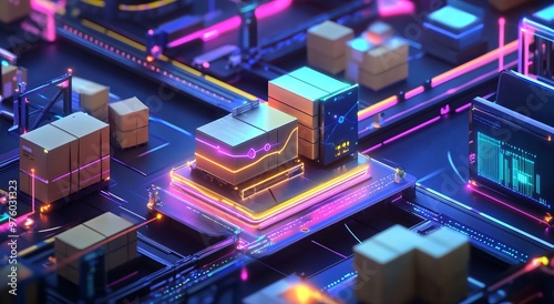Digital illustration of an advanced technology hub with smart packaging and microchips
