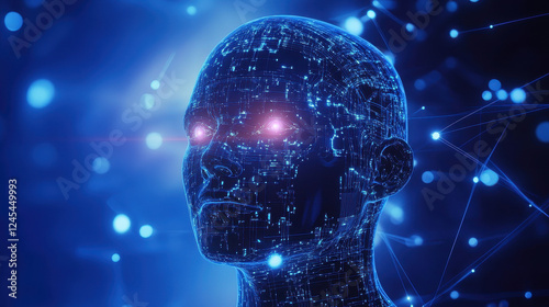 Digital illustration of an AI head with digital connections and glowing lights, symbolizing artificial intelligence technology in the background