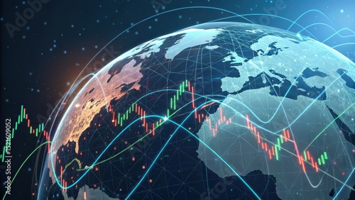 Digital illustration of Earth overlaid with glowing stock charts and global data lines, symbolizing international finance, trading, and connectivity.