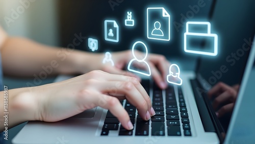 digital illustration of hand typing on laptop keyboard with futuristic floating icons representing online communication, modern technology, and digital network innovation