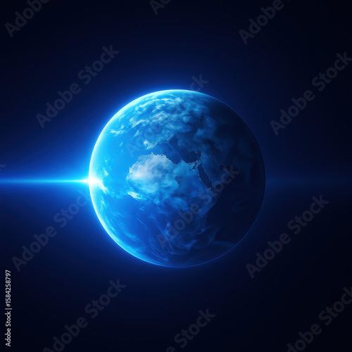 Digital illustration of planet Earth viewed from space, illuminated with a bright blue glow and sun flare on the horizon