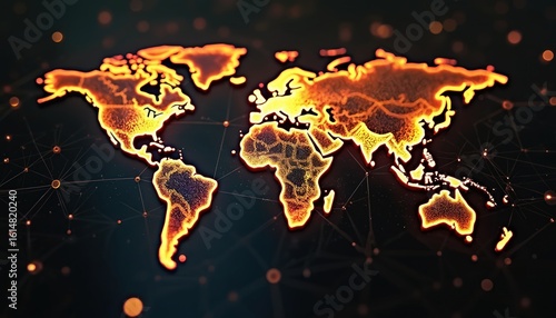 Digital illustration shows glowing world map with continents outlined in firey orange. Lines, nodes connect global regions, visualizing data flow, network connectivity. Abstract representation of