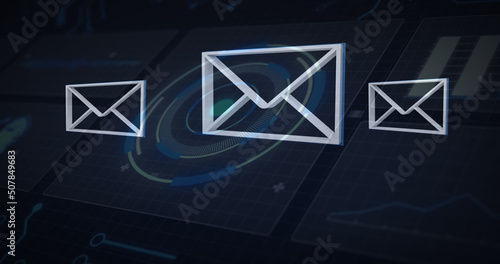Digital image of multiple message icons floating against round scanner on blue background