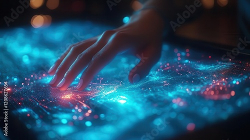 Digital innovation, close-up of glowing digital tools and tech, hands navigating touchscreen