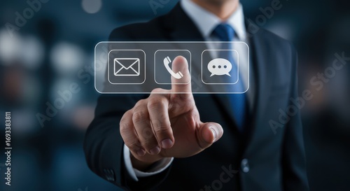 Digital Interaction at Hand: A close-up shot of a well-dressed professional engaging with a virtual interface, symbolized by iconic communication methods: the email, the phone, and the messaging icon