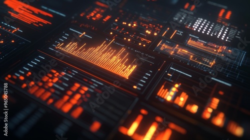 Digital interface showcasing glowing orange data visualizations, charts, and graphs, highlighting statistical information and analytics on a futuristic dashboard.