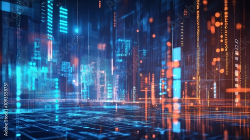 Digital landscape showcasing vibrant blue and orange data streams in a futuristic city environment