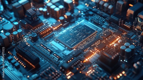 Digital landscape shows a complex blue motherboard with electronic components and illuminating connections