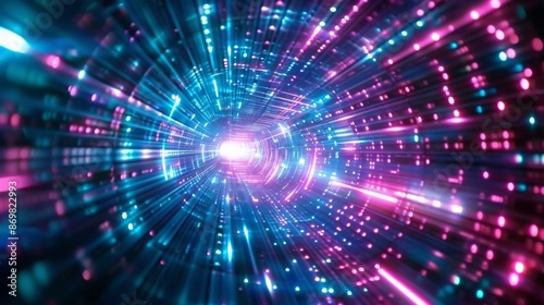 Digital landscape with Abstract teal and pink lights. Neon speed. Motion in a tunnel at light speed.