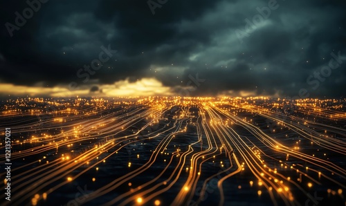 Digital landscape with glowing lines and particles representing data flow, illuminated against a dark stormy sky