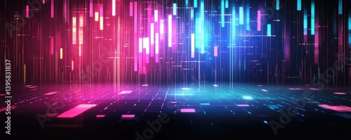 Digital Lights rain down on floor. Futuristic space illuminated with blue and pink colors