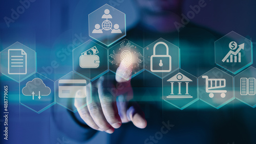 Digital marketing, Businessman point modern virtual interface banking in hand with icon network connection, shopping and mobile payment online on dark background