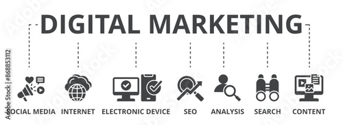 Digital marketing concept icon illustration contain social media, internet, electronic device, seo, analysis, search and content.