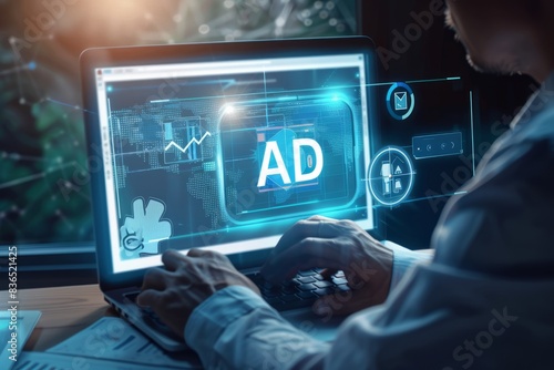 Digital marketing is the concept of selling online, where merchants use laptops to display ads on a glass screen on a virtual transparent background,