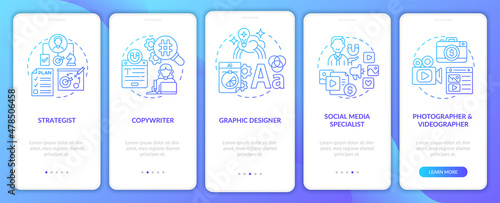 Digital marketing jobs blue gradient onboarding mobile app screen. Work walkthrough 5 steps graphic instructions pages with linear concepts. UI, UX, GUI template. Myriad Pro-Bold, Regular fonts used
