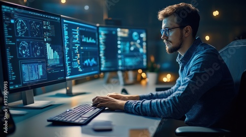 Digital marketing specialist designing ads on a high-tech computer setup