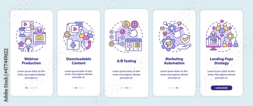 Digital marketing strategies onboarding mobile app screen. Online promo walkthrough 5 steps graphic instructions pages with linear concepts. UI, UX, GUI template. Myriad Pro-Bold, Regular fonts used
