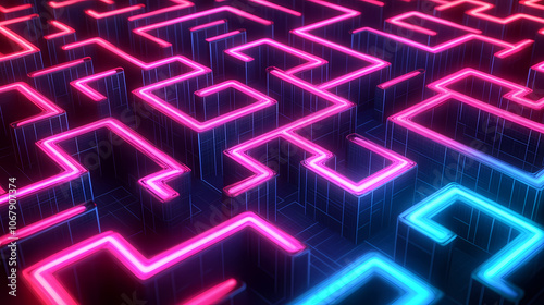 digital marketing strategies visualized as a complex maze of neon light paths. Neon. Illustration