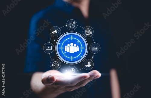 Digital marketing targeting concept. Businessman with marketing icons represent targeting, customer engagement. global reach, Modern strategies in online marketing, customer acquisition, sales growth,
