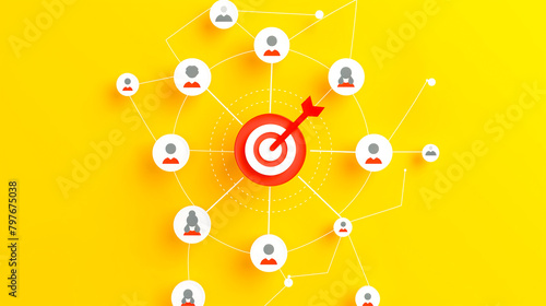 Digital marketing visualization with a network of contacts pointing to a central target, strategy and analytics concept