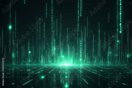 Digital matrix background with green glowing binary code, vertical lines of numbers in the dark space, technology and digital world concept.