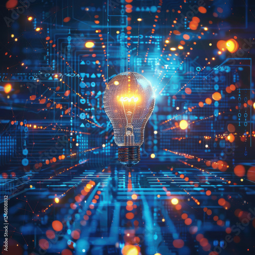digital matrix environment featuring glowing lightbulb amidst vibrant circuitry and pulsating lights evokes sense of innovation and creativity