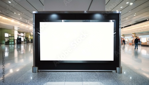Digital media blank black and white screen modern panel signboard for advertisement design in shopping centre gallery, mock-up with blurred background, digital kiosk