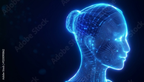 Digital Mind: Abstract profile of a woman's head, rendered in glowing blue digital lines, suggesting artificial intelligence, futuristic technology, and the digital self.