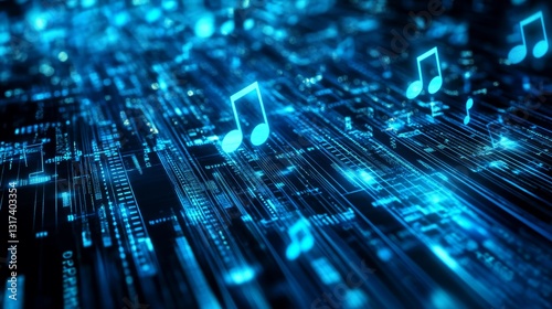 Digital Music Notes Flowing on Circuit Board - Technology and Music Concept
