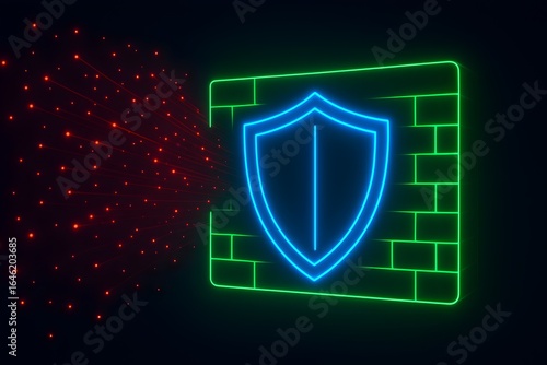 Digital Neon Cybersecurity Shield Illustration – Electric Blue Stylized Shield with Intense Green Virtual Firewall and Red Glowing Particles Repelled for Cyber Protection