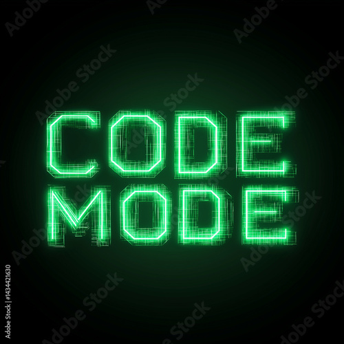 Digital neon effect. "Code Mode" glowing green text on black background. Perfect for programming, tech, and cyber-themed designs.
