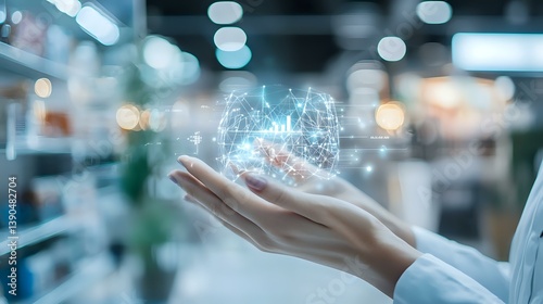 Digital network sphere floating above female hand in white sleeve, glowing with futuristic connections against blurred modern office background with bokeh lights.