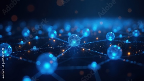 Digital network with glowing blue spheres and connections in dark background