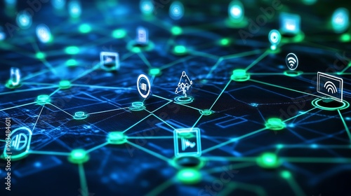 Digital network with interconnected icons representing technology, communication, and data transfer in a futuristic blue and green theme.