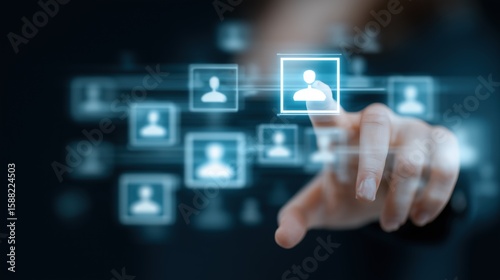 Digital Networking: A hand elegantly interacts with a digital interface, selecting a profile icon from a network of glowing user profiles. This image represents connection.