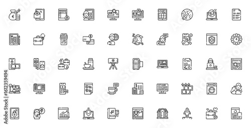 Digital Nomad icon set. Minimal vector illustrations. Includes symbols for income, travel, content writing, online shop, productivity, vlog, research, startup and more. Editable stroke.