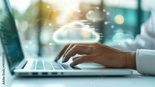 Digital Nomad Working on Laptop with Secure Cloud Computing Applications for Business Data Storage