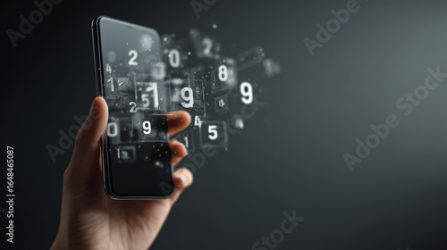 Digital numbers floating from smartphone screen held by hand, technology concept with dark background and glowing numeric data