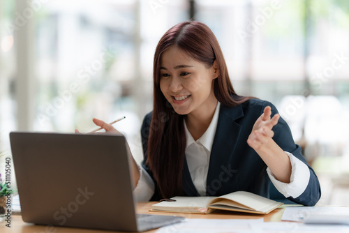 Digital Online meeting concept. Asian Business woman having conference with her partners by laptop computer at office.