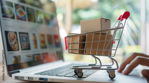 Digital online shopping concept, miniature cart with boxes on laptop keyboard and blurred web store interface background