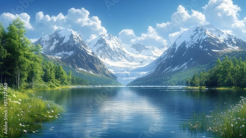 Digital Painting of Alaskan Fjord with Snow-Capped Mountains, Ice Glaciers, and Lush Forests - Serene Natural Beauty